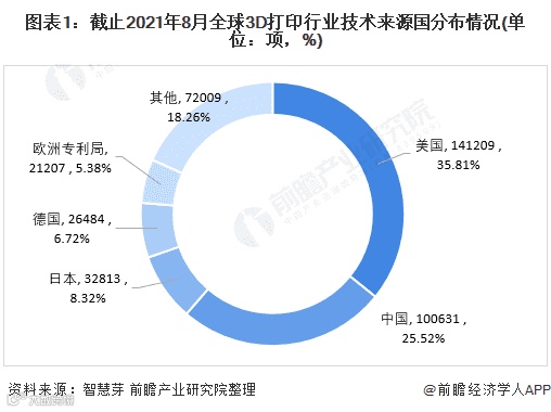 目前,全球3D打印第一大技术来源国为美国,美国3D打印专利申请量达到141209项,占全球3D打印专利总申请量的35.81%;其次是中国,中国3D打印专利申请量占全球3D打印专利总申请量的25.52%。日本和德国虽然排名第三和第四,但是与排名第一的美国及排名第二的中国专利申请量差距均较大。