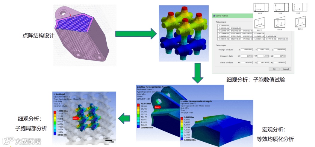 目前,安世亚太已经开发了一系列针对各种工业品和消费品的创成式设计方法,国外也开发了以nTopology为代表的增材设计仿真软件,其基本的解决思路是通过创成式设计等智能化设计方法,实现点阵、TPMS等多孔结构的自动化设计,以宏细观结合多尺度算法为基础的等效均质化力学方法获取点阵结构宏观力学特性,然后再回到细观,基于宏观计算结果对点阵结构进行局部细节模拟。