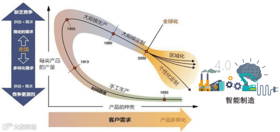 作为一种生产设备依赖更少的数字化制造技术,增材制造将有可能改变某些产品的生产模式,给企业和消费者带来巨大的经济和社会效益。人类从古至今的生产模式经历了手工生产、机械化生产、智能化生产三个阶段。在漫长的手工生产阶段,心灵手巧是核心竞争力,每个工匠每一次制造的商品都可以不一样,但是生产力及其有限。在机械化生产阶段,产品按照统一的标准生产,生产设备的效率是核心竞争力,但是缺少个性化的定制。当前随着数字化技术的发展,生产模式进入智能化时代,大规模定制能力成为核心竞争力,生产效率和灵活应变兼顾,对于生产模式的变革提出了巨大挑战。