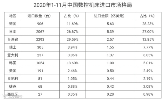 对中国而言,瑞士是机床的主要进口国和地区之一。2020年1-11月,中国从瑞士共进口了305台数控机床,尽管只占全部进口数量的3.94%,但瑞士机床广泛应用于我国航空航天、军工制造等关键领域,与国家安全息息相关。