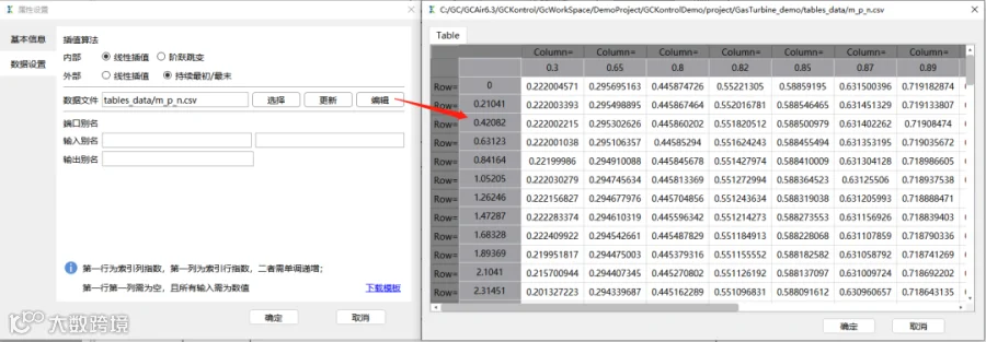 将编辑好的csv文件,导入模块中,插值算法内部选择线性插值,外部选择持续最初/最末(若求得点超出样例范围,则取样例范围边界值),右侧的表格界面支持编辑,编辑成功后,源文件内容也会随之改变。