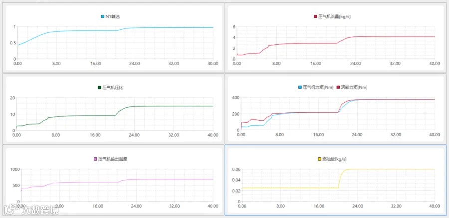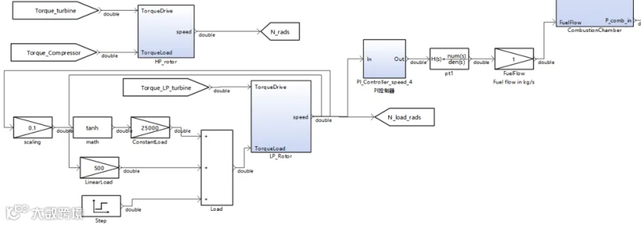 通过PI控制器,去影响燃油的输入,而由于燃油的输出扭矩,也会影响到这个负载力矩。下图为N1转速和燃烧温度的变化。