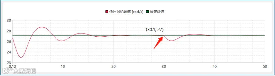 低压涡轮的转速随着时间变化,大约在27rad/s。在外部给定一个27rad/s的速度,与低压涡轮的转速做差,输出非常小的数值。在第30秒时,低压涡轮转速因为负载力矩的变化,从稳定变为下降,最终还是回到27rad/s的速度。