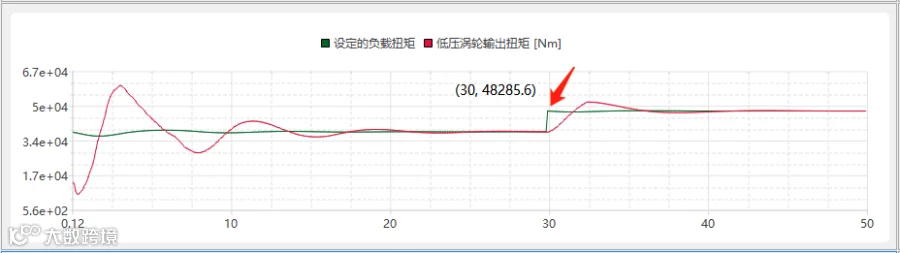 设定一个变化率在-25%~25%的负载,如下图。在前30秒,低压涡轮输出扭矩会逐渐趋于设定的负载扭矩。在第30秒,给定一个阶跃为10000Nm的值,可以看到,低压的涡轮输出扭矩随着时间变化,慢慢与设定负载吻合。(数值显示了箭头所指点)