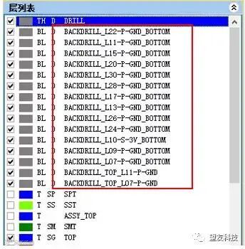如果 PCB CAD 数据包含有 backdrill 文件,当读入数据后,在左下方层列表栏会显示背钻孔层,如下图三、图四所示。