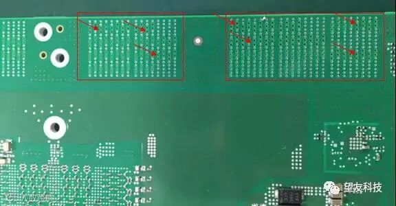 我们先通过一个实物 PCB 照片来看,如下图二红色框内的孔是用来安插连接器引脚,其中红色箭头指向的这些孔是经过背钻(backdrill)处理的,没有镀铜不能用做测试点,而其它没有经过背钻处理的孔可以作为测试点使用。