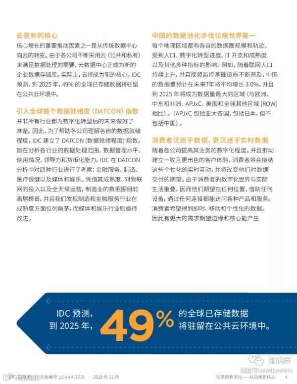 | 2019年3月8日,希捷携手国际数据公司(IDC)共同发布的《数字化世界——从边缘到核心》白皮书以及《IDC:2025年中国将拥有全球最大的数据圈》白皮书的主要研究成果。根据白皮书,全球数据圈将从2018年的33ZB增至2025年的175ZB。中国数据圈最快速地增长,到2025年,中国预计将以48.6ZB的数据量成为全球最大的数据圈。 报告显示,数据增长及其不断增长的价值正在改变中国的消费者和商业环境,数据正在塑造消费者、政府、应急服务提供商和企业的工作方式。企业正在利用数据进入新市场,更好地为现有客户提供服务、简化运营,甚至通过出售数据创造新的收 入来源。 从现在到 2025 年,企业需要了解数据的作用,以及数据圈的发展趋势。企业需要以数据守护者的角 色,利用云,并采用全球性的方法处理数据。但是组织机构需要优先考虑数据管理和创新,以在数字时 代保持竞争力,因为所有行业的数字化颠覆者都会将数据驱动型创新作为其首要任务。 消费者正在与数据建立起更多更深层次的连接,并在他们选择的时间和地点更方便地访问产品和服务。他们还受益于医疗技术的进步,享受新的娱乐形式,生活在更为智能的家庭和城市之中。他们也开始期待更加智能的产品和服务——这些产品和服务可以随时间进行自主学习,并在不破坏数据隐私的前提下提供准确、个性化的体验。 数据的快速增长以及应用模式的转变是未来数据生态圈的大势所趋。而如此规模庞大的数据对置身于该经济体的企业和政府等来讲,机遇与挑战并存,有效合理地挖掘数据价值将会成为推动经济增长的重要助力。此外,数据安全、实时性以及碎片化是企业需要特别关注的方面。只有洞悉数据发展趋势,制定合理的数据管理、应用策略,才能在数据星球中进一步提升企业价值以及竞争力。 数据蕴含的价值难以估量,而未来中国如此规模庞大的数据对置身于该经济体的企业和政府等来讲,机遇与挑战并存,有效合理地挖掘数据价值将会成为推动经济增长的重要助力。数据已然成为了不可或缺的关键生产力,而科学合理地获取、存储、分析以及利用数据成为抓住商机的最有效途径。 作为数据生态产业链中至关重要的一环,存储对于企业实现其数据价值的重要性不言而喻。40年来,希捷一直聚焦于技术的研发和创新,专注数据创建、物理设备、数据安全以及数据流等四大研发支柱,以独特的技术满足数据爆炸产生的存储需求,助力企业挖掘数据星球的潜力,获取更多的价值,促进数据生态圈的健康稳定发展。