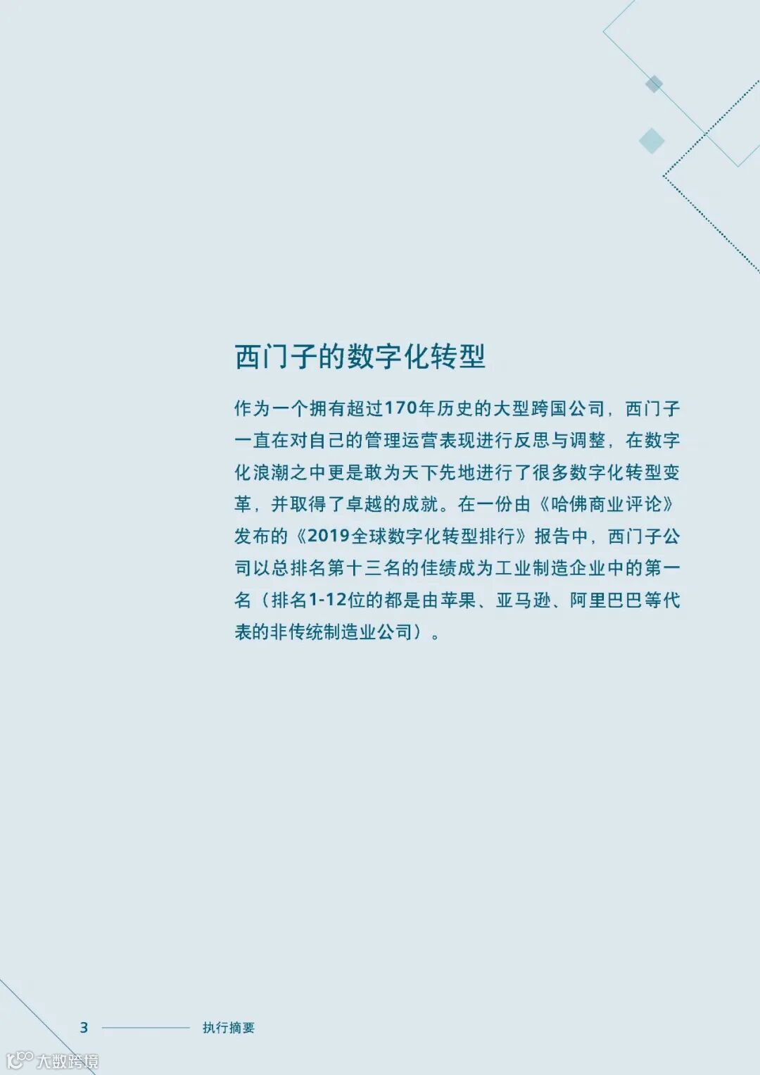 在一份由《哈佛商业评论》发布的《2019全球数字化转型排行》报告中,西门子公司以总排名第十三名的佳绩成为工业制造企业中的第一名(排名1-12位的都是由苹果、亚马逊、阿里巴巴等代表的非传统制造业公司)。
