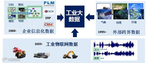 对制造企业而言,高效的处理和使用工业大数据将有利于企业在新一轮产业竞争中占据产业发展的制高点。工业大数据主要涵盖三类数据,即企业信息化数据、工业物联网数据以及外部跨界数据(见下图)。