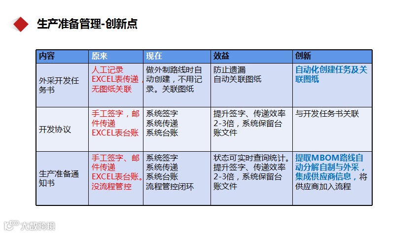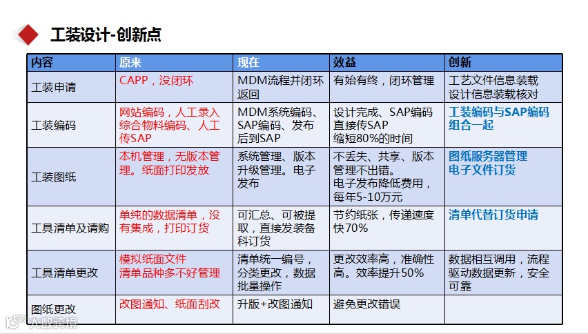 开目MDM制造数据管理系统的上线,取代了多个零散信息孤岛,打通了企业信息化建设的“任督二脉”:文件签审模块取代了技术文件发布系统,文件批准后直接到达用户待办任务;工装管理模块兼顾了综合物料编码系统,工装编码的同时直接传入SAP;工艺属性管理模块取代CRS系统,产品客户需求增加油漆防护喷涂属性后直接指导油漆看板;签审模块替代OA技术文件签审,支持OFFICE、PDF、CAD格式文件电子图片签名;系统可扩展性强,不开发程序还可增加任意的对象+流程。