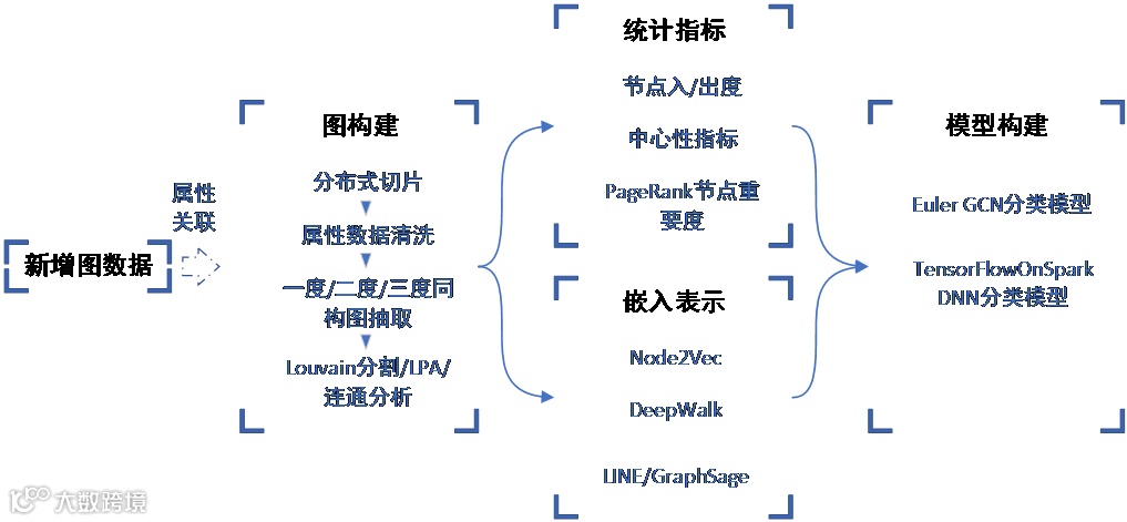 3、图模型:结合具体的业务场景,构建图模型。具体可借助Euler建模平台,构建GCN等图分类模型,也可借助TensorFlowOnSpark框架,实现基于TensorFlow和Spark的分布式深度学习模型构建。