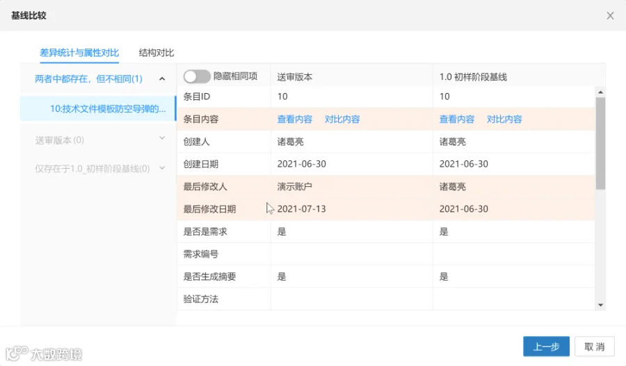 通过建立需求基线,使需求文件的大纲结构、条目版本、属性、视图、链接、模板、历史记录等信息形成状态快照,保证产品或项目各阶段需求数据的完备性,支持对不同需求基线中的条目结构和属性信息进行比较,并提供明显的差异提示;