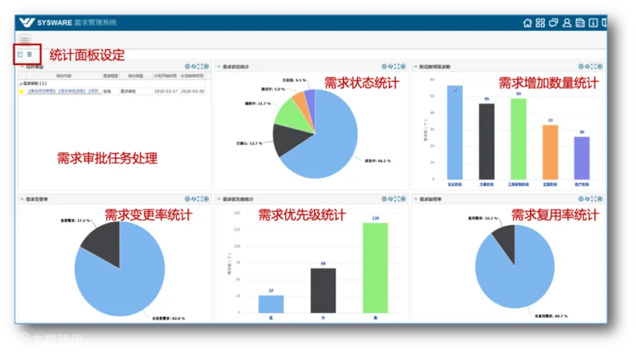 基于图形化的统计方式,依托统计监控看板,展示多种维度的需求统计分析视图。此外,该统计监控看板须支持用户配置个人关注的数据统计视图,以及设置每个视图的数据过滤条件,并提供多种比例的看板布局,且支持调整视图在看板中的所在位置;