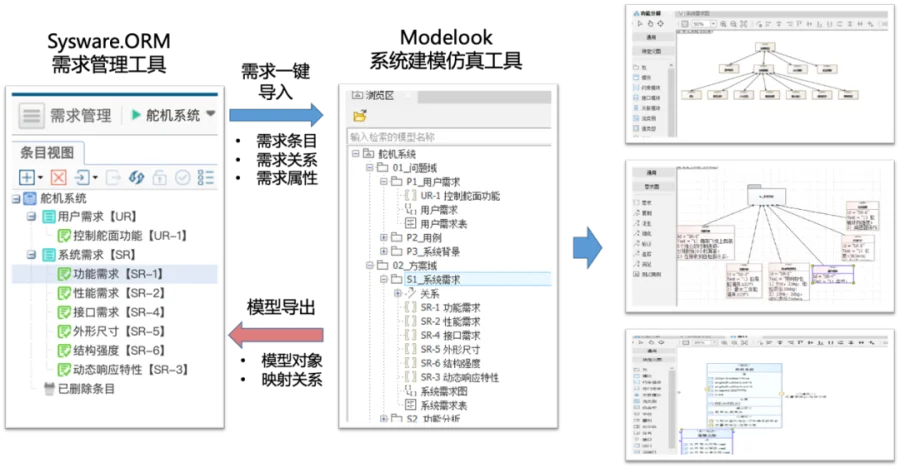 SYSWARE.ORM提供丰富的工具集成适配器。支持从WindChill中同步需求信息架构,从Doors中迁移需求条目数据,并支持与自家产品Modelook系统建模工具集成,可将需求条目转化为系统模型,辅助基于模型的系统工程(MBSE)方法有效落地。