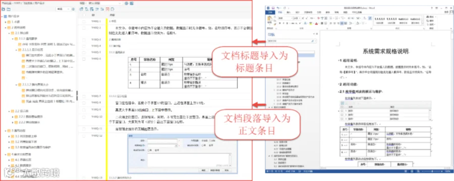 用户可以将Word文档中的章节和内容快速导入本系统进行条目化管理,并且导入后的条目内容样式(如表格、图表、公式等)与原文档保持一致;
