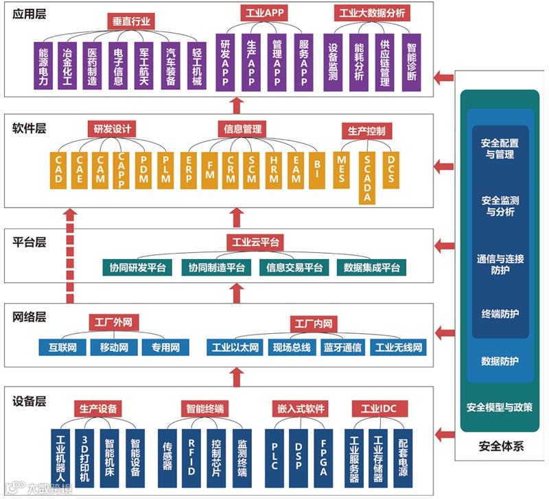工业互联网体系架构可以分为设备层、网络层、平台层、软件层、应用层等五大板块。