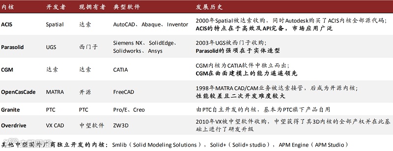 达索等厂商看到了单独销售3D内核的商机,陆续将自身的内核独立出来作为单独的生意,供应了全球200多家客户。国内厂商中望软件、华天软件分别拥有 Overdrive、CRUX4内核,数码大方拥有自主开发的内核。