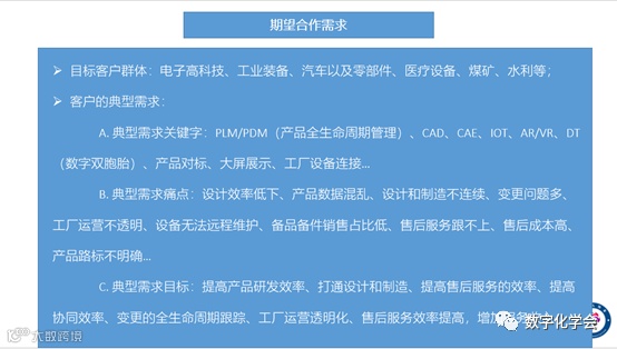 数字君总结了本次会议讲演企业所展示的产品优势和企业优势以及对应的合作需求,如有合作意向的企业单位欢迎与学会联系,洽谈合作。(讲演企业的完整PDF和会议视频后续会发布在本微信公众号及数字化学院上)