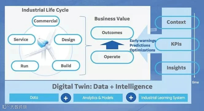 例如,风力涡轮机模型中包含:具有材料和组件细节的PLM系统信息、3D几何模型、可根据物理算法预测行为的仿真模型、或者利用机器学习进行分析所得的操作建议。