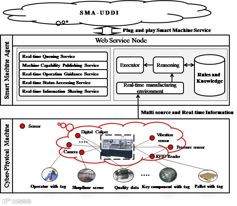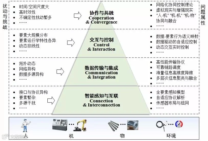 如图2所示,物理是指通过可靠感知物理车间内人、机、物、环境异构全要素信息,实时传输动态网络环境下海量感知数据至信息层,集成规约多源多模态异构数据,并精准控制混杂动态环境下车间异构制造资源的行为协同,从而实现车间内“人-机-物-环境”全要素的智能感知互联、高效数据传输与集成、实时交互与控制、智能协作与共融。