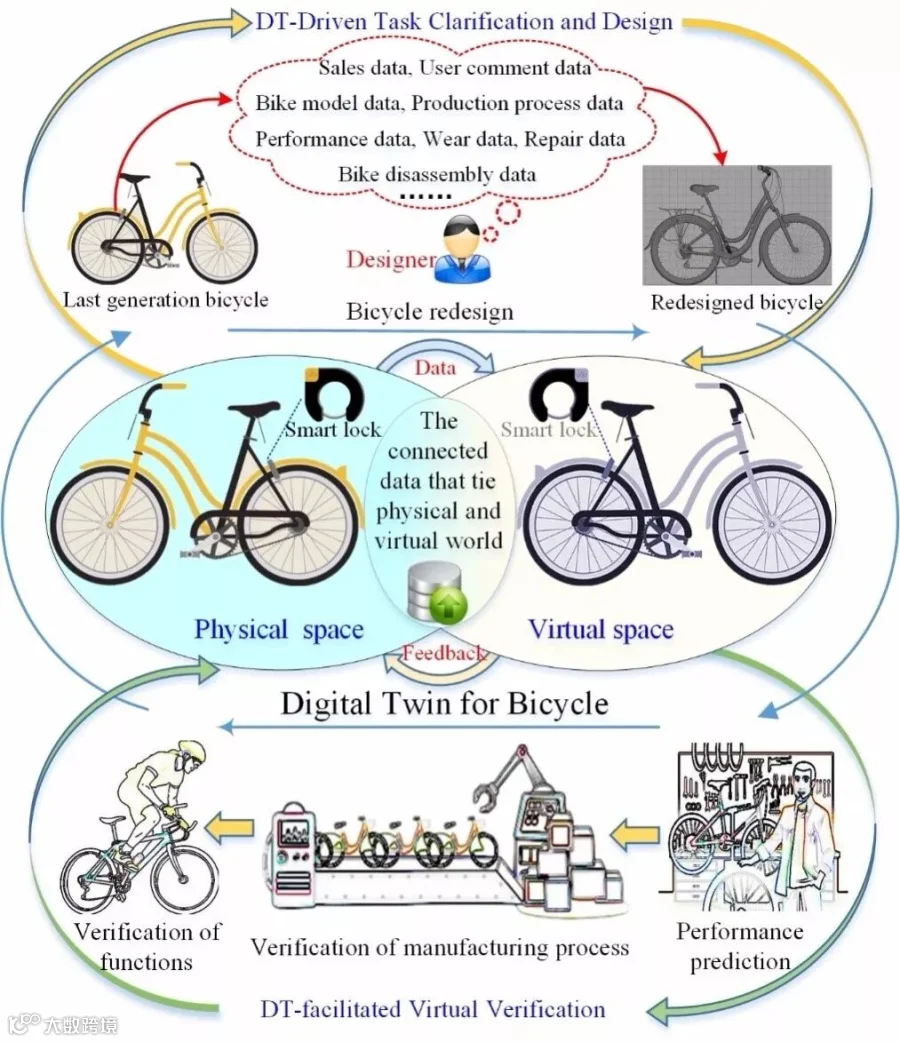 虚拟验证部分包括性能预测、制造过程验证、功能验证三个步骤。在性能预测中,设计人员使用维护和故障的历史信息以及工程和材料科学的知识来模拟各种物理世界中的操作,并实时预测性能指标的变化。例如,自行车的数字孪生模型可以预测后排座椅重量增加时,后座车轮和轮胎压力等相关参数的变化。在接下来的制造过程验证中,设计人员使用数字孪生模型来模拟自行车的制造过程。一方面,通过虚拟空间的模拟,设计人员可以在最短的时间内确定最佳的工艺流程。另一方面,通过精确的模拟可以降低高次品率步骤。例如,通过对材料和设备的关键步骤和数据关系映射的模拟,可以减少一些组件的断裂。最终的功能验证部分,首先通过整合客户的物理数据来验证自行车的人机工程学,并找出可能存在的设计问题。其次,通过整合各种环境数据来验证不同情况下自行车的功能。例如,制动距离、轮胎磨损速度、后座寿命等,都可通过孪生模型在不同的情境条件下进行测试。在虚拟验证中,一旦发现不合格的问题,可通过迭代设计过程来改进设计方案。