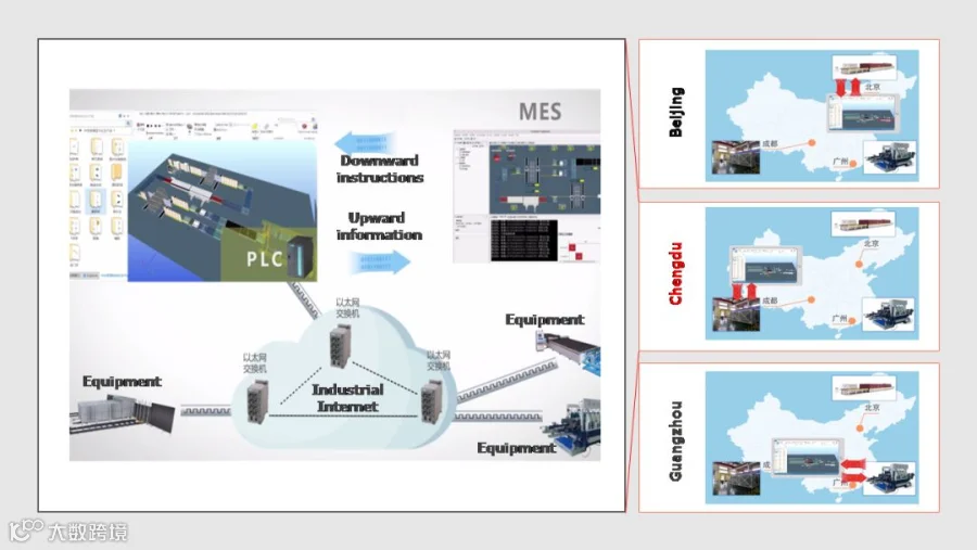 如图4所示,提出了新型的智能车间分布式集成方法,支持不同单机供应商的设备进行异地上线测试。搭建工业控制网络,建立车间数字化模型与车间实物设备之间的通讯通道,利用软PLC控制数字化模型的动作,利用脚本控制在制品运动;通过下行指令二分、上行信号互较等机制,实现车间数字化模型与实物之间的动作与运动同步,大幅降低集成周期与集成成本。