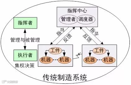 ①被调度:传统制造系统下调度主动权由指挥中心(管理者或调度器)掌握,指挥中心安排工序使用的具体机器、加工时间及顺序,是现有常见的调度方式;