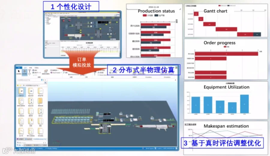 如图5所示,论文搭建了中空玻璃自动化生产线快速定制设计与优化系统,研发了首条国产中空玻璃自动化生产线及其数字孪生系统,通过订单的模拟投放与整线的近物理仿真运行,进行整线性能评估与调控,初步试验结果表明该方法能有效提高了中空玻璃自动化生产线的定制设计效率与制造执行性能。基于数字孪生搭建的智能车间定制设计方法与平台具有多种应用模式,如:1)快速化定制,根据客户的个性化需求,快速部署满足客户需求的自动化生产线;2)分布式集成,支持设备异地集成,降低了整线集成周期与场地占用成本;3)透明化监控,通过将现场信息实时反馈到模型与系统,实现跨粒度、全视角的透明化监控;4)智能化运维,通过订单的模拟投放,精准预测订单的交货期、执行成本。