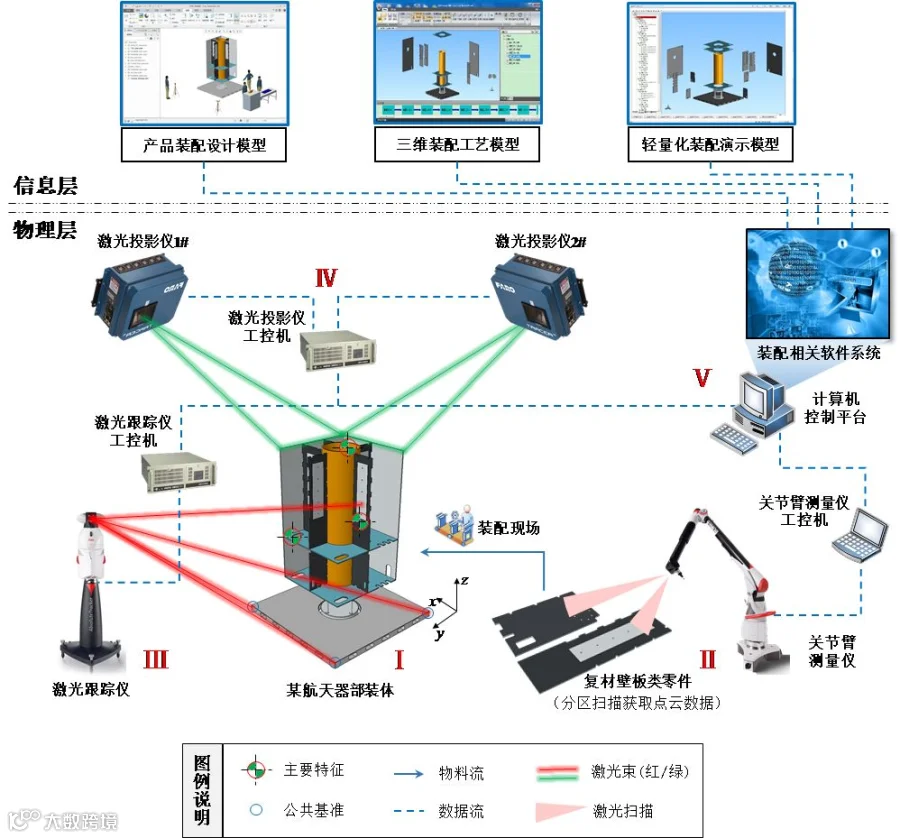 Ⅰ:装配部装体(局部);Ⅱ:关节臂测量仪设备及工控机;Ⅲ:激光跟踪仪设备及工控机;Ⅳ:激光投影仪设备(组)及工控机;Ⅴ:计算机控制平台和相关软件系统。