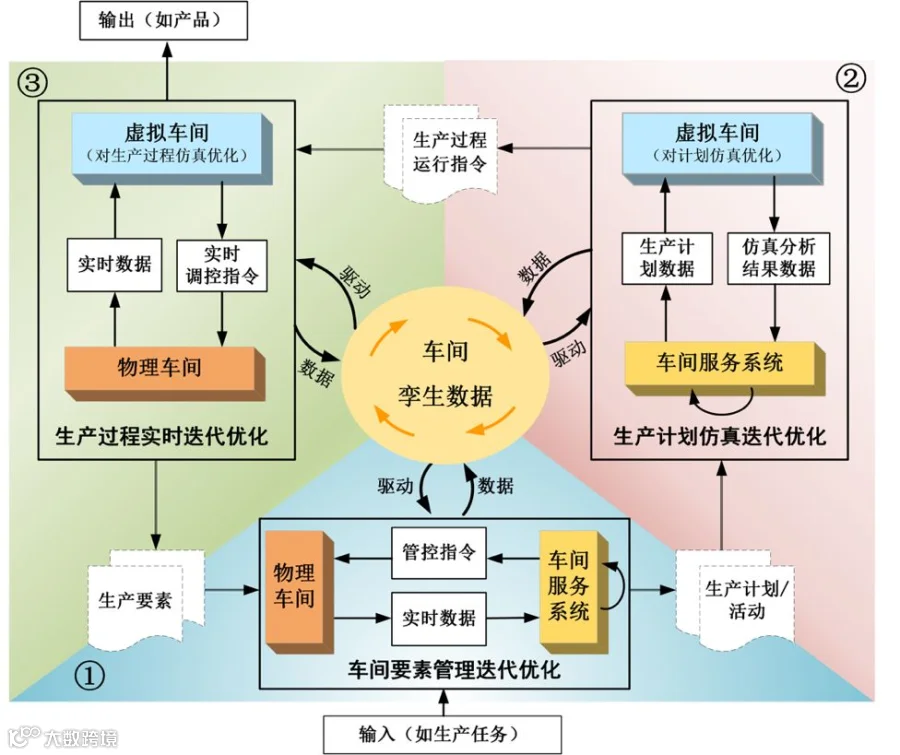数字孪生车间基于新一代信息技术和制造技术,通过物理车间与虚拟车间的双向真实映射与实时交互,实现车间全要素、全流程、全业务数据的集成和融合,在车间孪生数据的驱动下,实现车间生产要素管理、生产活动计划、生产过程控制等在物理车间、虚拟车间、车间服务系统间的迭代运行,从而在满足特定目标和约束前提下,达到车间生产和管控最优。