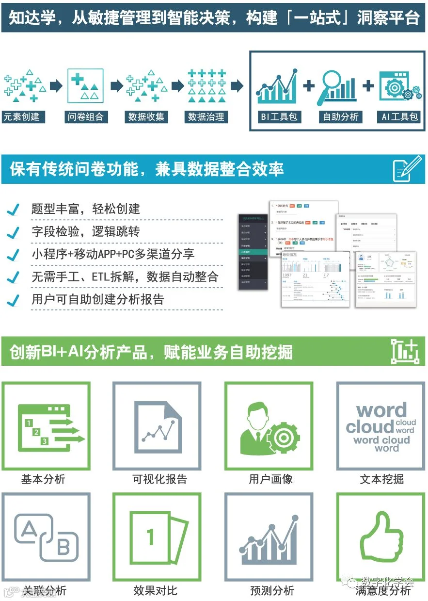 知达学专注于为企业提供「一站式」用户洞察工具,满足客户从数据敏捷管理到智能分析决策的端到端需求。知达学不仅具备现有市场表单产品的通用功能,同时通过产品设计革新,将表单元素“模组”化创建,以便于回收的表单数据跨项目、跨时间自动联结打通,从而实现后端「BI+AI」高阶分析,并赋能业务人员实现自助分析挖掘。