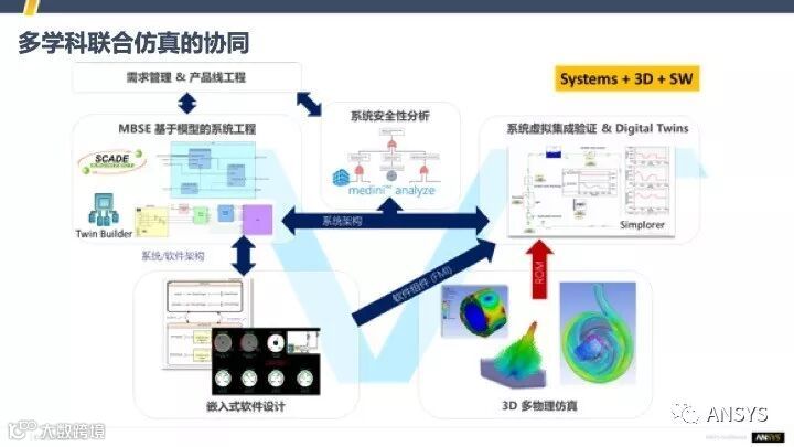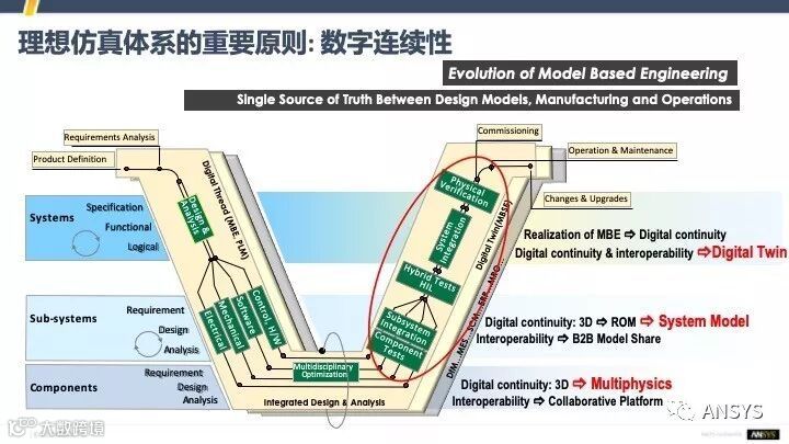讲完了仿真体系的三要素,其实背后还有一个重要的原则,就是“数字的连续性”。我们既然要构建数字化世界,要建立各种各样的模型,要把他们充分的利用起来,就是希望在产品的整个生命周期,产品的整个设计流程里面,把各种各样的模型更好地连接起来。这个连接分为三个维度,第一个就是多物理场的连接,就是在不同的物理场之间能够相互的交互,这是底层做详细设计的时候,用到最多的。第二个连接就是从部件到系统的连接,我们需要把各学科、各部件的模型跟系统形成多学科的连接。第三个连接就是把虚拟世界跟物理世界连接起来,这就是我们前面提到的Digital Twin的连接这,就是当我们仿真做的很好了,有很完备的数字样机的时候,再跟物理世界去做一个关联,让它们之间去相互校验。因为有的东西是物理世界能够获得的容易获得的,有的是数字世界擅长做的,把这两个世界充分结合起来去相互促进,这才是最佳的效果。