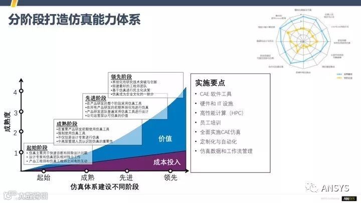 如果想要做成这样的仿真体系,我们建议分阶段来实施。首先做相应的仿真能力评估,当评估完成之后,我们就清楚了现在的成熟度状态,也清楚了将来的目标是怎么样的,每一期的实施的要点应该是什么,再一步一步地去实施搭建。