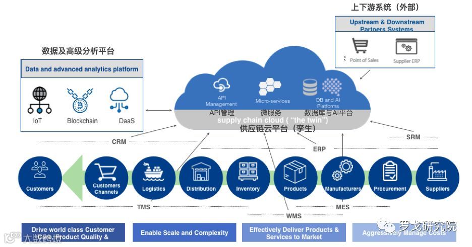 图2所定义的供应链孪生包括实体的供应链及其执行系统和设施,以及它们的数字表示,也就是数字孪生:供应链云平台和一个数据及高级分析平台。