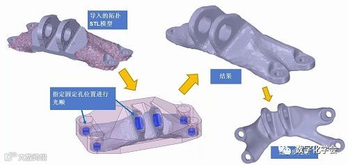 专业分析软件(如Ansys)的拓扑优化技术允许用户指定材料体积上的支撑点和载荷点位置,设置边界条件并让软件找出最佳形状。这种优化结果模型往往都是STL模型,可以导入Pidex中进行结构的调整和光顺,例如指定精确的孔位,指定参考的传统模型,利用Pidex的收缩包络功能,可以快速进行拟合,得到所需的光顺模型,再根据设计需要调整后就可以进行3D打印。