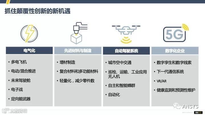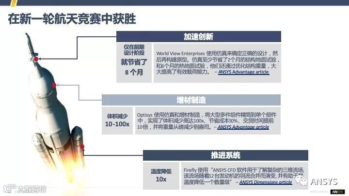 我们再看看航天行业,这个行业正面临着新一轮的航天竞赛,美国发布了新的登月计划,登陆火星也是各个航天大国都在往前努力的一个方向,在航天行业中也很多新兴的企业,他们用一些新的技术去解决我们传统的很多企业里面遇到的、关心的问题,比如说设计周期,比如说我们制造产品体积。中间那个例子来自Optisis,他们在做的就是把之前很多的部件,比如天线、连接器等,用增材制造技术去尽量地精简,实现了部件数量的减少,产品体积的减小,产品成本的节省,交货时间的提前,这些都是他们获得的众多好处。最后那个民用航天技术公司Firefly,他们也是把仿真的各种各样的数字化技术运用到极致,使他们产品的性能得到大幅度的提升。
