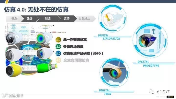 我们可以再简单地回顾一下仿真技术的发展。仿真最早是在设计层面做一些验证的事情,再从单一物理场扩展到多物理场,再然后做的比较好了,就能在整个设计周期里面把更多的东西都能够通过仿真技术来进行研究,这就叫数字样机,或者叫数字原型。但是这样的数字样机,它的寿命其实并不应该终止,应该继续使用。因为我们的样机如果构建的很好,能够进一步使用的话,它会带来更多的价值,可以去做更多的事情。如果我们在运行阶段,继续用上这样的数字原型,它就变成了Digital Twin。还有一类场景,就是我们在设计早期如果也能把数字化技术用进去,就可以做各种各样的数字化的探索。这时候,我们就发现数字化仿真已经嵌进了产品的整个生命周期,而不仅仅是设计研发周期。仿真模型跟我们产品一样,它是在一开始有一些初样,然后逐步的生长、发展、壮大,直到成年。成年之后,它需要考虑怎么样去跟物理世界做关联,甚至它也会老去。我们之前的数字化是做了一些仿真,但最大的一个特点就是它是不会变的。实际上我们物理的东西它是一直在变的,我们需要把这两个世界,进一步地关联起来,仿真模型会随着设备的磨损、老化,进一步地发生改变,它也会同样具有这样的寿命。设想一下,如果我们能够往这个方面去考虑的话,会发现很多很多的事情会有比较重大的价值上的变化,它的价值会变得更大。