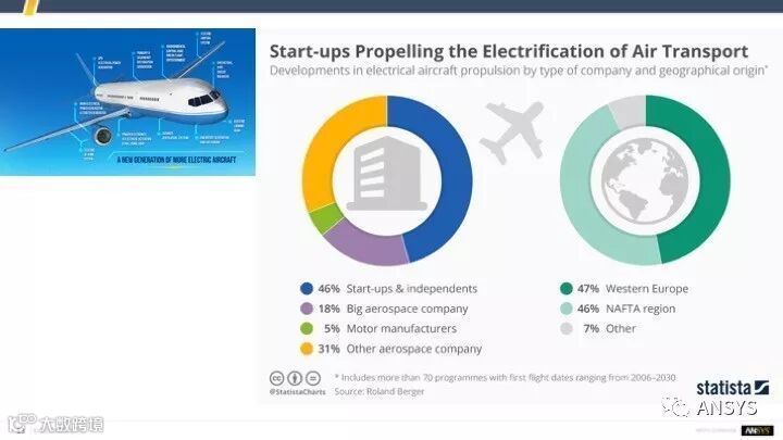 以电气化为例,现在航空业也在往电气化方向发展,正越来越多地谈到多电飞机、全电飞机,船舶行业也会谈到多电船舶、全电船舶。我们看到汽车行业也正发生这样一个颠覆性的变化:传统的车企,不得不去做新能源汽车,这不光是国家政策的一个要求,而是技术发展的一个要求。回头看看过去这几年汽车行业的一个案例就会发现,现在新能源车做的特别好的是像特斯拉这些新兴的企业,而传统的车企正在向他们学习。那么,我们其他的行业会不会受到同样的发展挑战呢?我相信很有可能。因为有这样一个调查,是国外的一个调查机构做的,在研究多电飞机这样的新兴技术的公司,会发现46%的是初创企业,他们会更有驱动力、更有变革的敏捷性来做这件事情。而这个调查让我们中国人更感到担忧的就是,中国属于那个只占7%的others地区,而93%都来自于西欧和北美。那我们会不会需要把行业和这些先进的技术发展方向连接起来呢?毋庸置疑这是很有必要的。那我们该怎么去做呢?用传统的方式是不是足以适应这样的变化呢?这是我们值得来考量的。