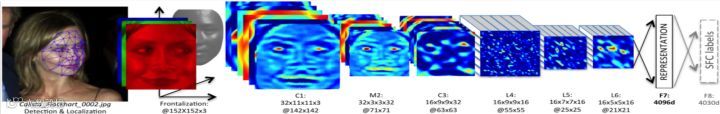 一个完整的人脸识别系统,需要完成人脸检测和人脸校准(face alignment),而后者是需要人脸关键点(facial landmarks)的检测,也是可以基于CNN模型来做。 这里以FB的DeepFace模型为例吧,给出一个人脸识别的系统框图:
