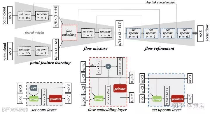 图像像素运动是optic flow,而3-D场景的运动称之为scene flow,如果有激光雷达的点云数据,后者的估计可以通过ICP实现,这里给出一个CNN模型的实现方法FlowNet3D,是PointNet的扩展: