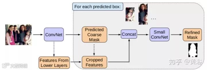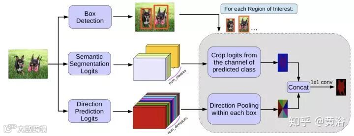 而下面这个是从目标检测算法Faster-RCNN演变的实例分割模型MaskLab,论文发表在去年CVPR‘18。