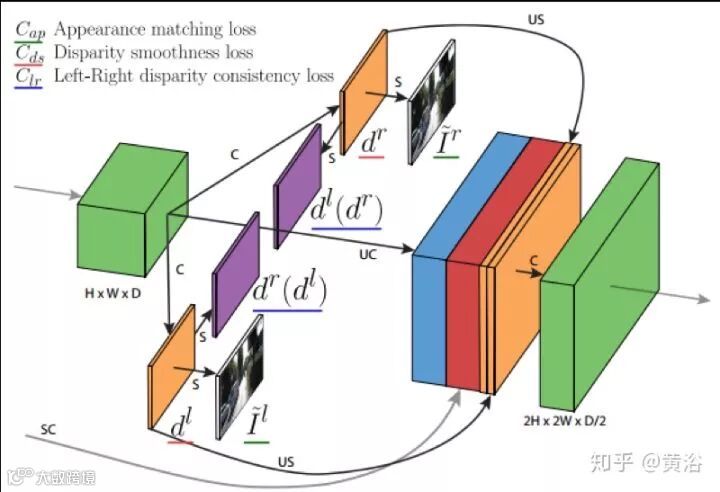 而这个是单目估计深度图的模型: 巧妙的是这里利用双目数据做深度图估计的非监督学习。