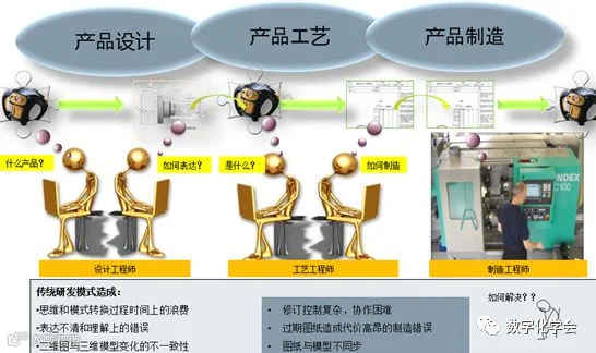 中国制造业的传统产品研发模式有:以图纸为中心和二三维混合设计。数据的不统一和表达不直观,造成各个部门之间存在沟通壁垒。