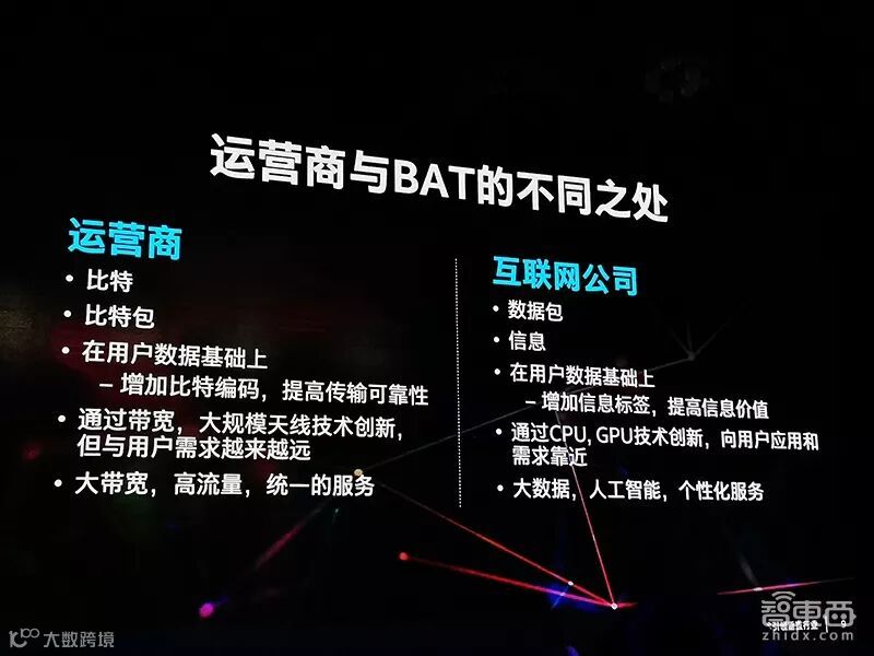 因此,5G时代的运营商要改变思路,现在我们传输的不仅仅是比特了,更是信息。运营商要改变自己的思维,引入大数据、AI、个性化服务。