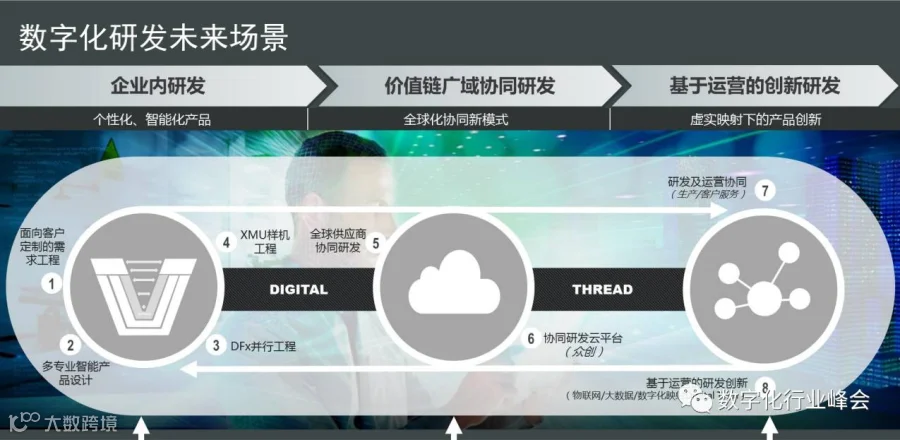 创新研发模式:如基于MBSE进行机、电、软多学科,跨设计、制造、服务多部门,引入全球最好的供应商进行研发的协同;追溯个性化的需求;利用AR/VR将设计模型用于销售、制造各个环节实现一处设计,处处使用……