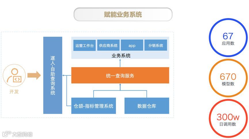 数据中台还会赋能业务系统开发通过统一查询服务 (主要是统一查询服务和标签服务) 来辅助业务过程中的决策。基于数仓里面加工好的数据模型,业务系统开发人员使用统一查询服务获取到的模型数据在业务系统中增加辅助决策功能。比如供应商系统需要对供应商进行评级,供应商评级需要供应商的商品销售数据、评论数据、退货数据、质量数据,供应商采购的交期数据等等。数仓会根据这些数据加工模型,供应商系统可以通过统一查询获取模型在供应商系统中使用。在严选,统一查询服务已经接入了 67 个应用、670 个模型、每天有 300w 的调用。