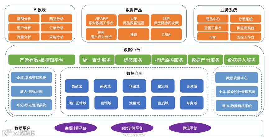 这是一个千人千面的问题。我们的定义是“数据中台是高质量、高效赋能数据前台的一系列数据系统和数据服务的组合”。因为规范最终是在系统和服务中落地的,所以定义中就没有包含规范部分。数据中台的核心职责是高效地赋能数据前台为业务提供价值。要想理解数据中台先要理解数据前台,上文说到的搜索、推荐、BI 报表、数据大屏等都属于数据前台。我们来看下面网易严选数据体系的图就更清楚数据中台的定位了。