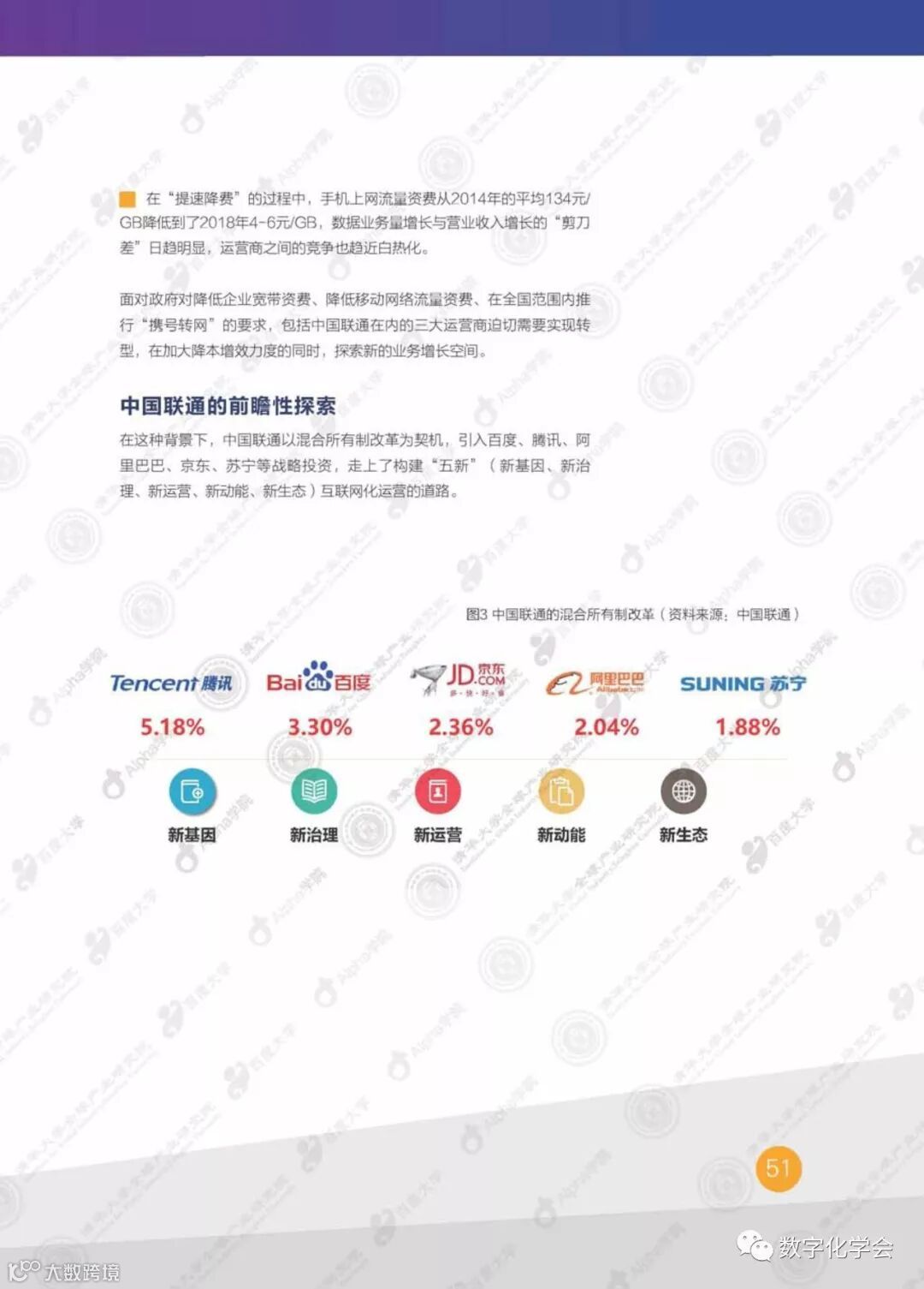 中国联通以混合所有制改革为契机,引入百度、腾讯、阿里巴巴、京东、苏宁等战略投资,走上了构建“五新”(新基因、新治理、新运营、新动能、新生态)互联网化运营的道路。