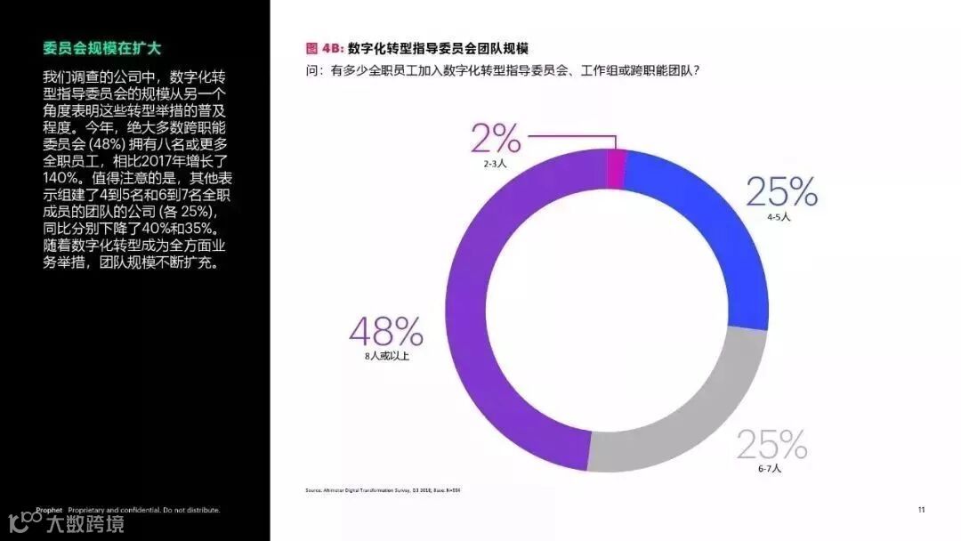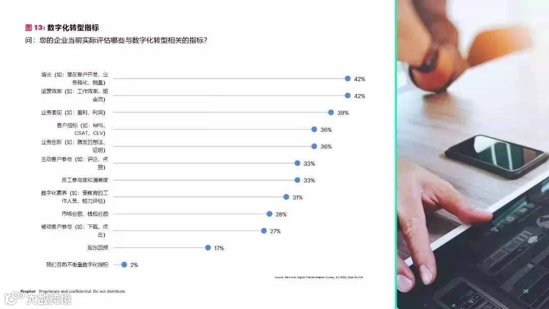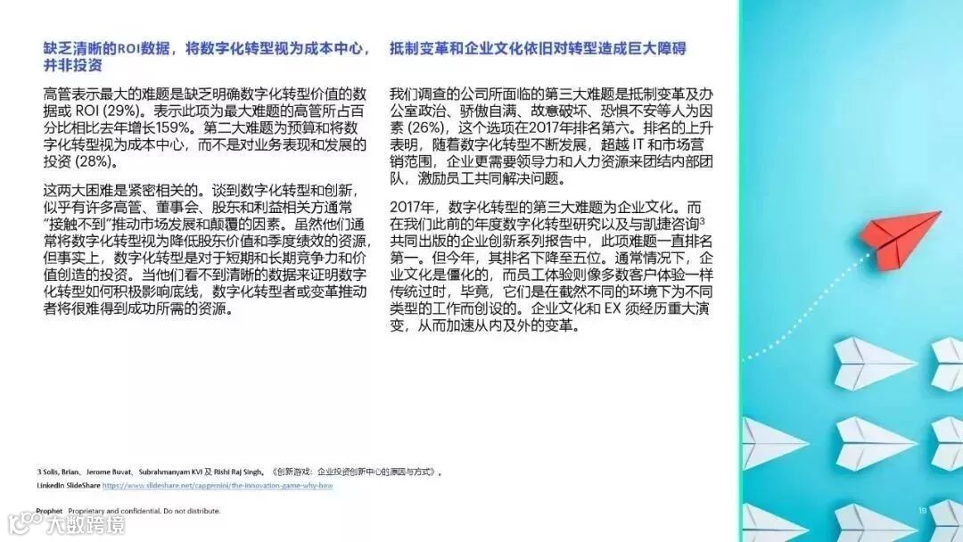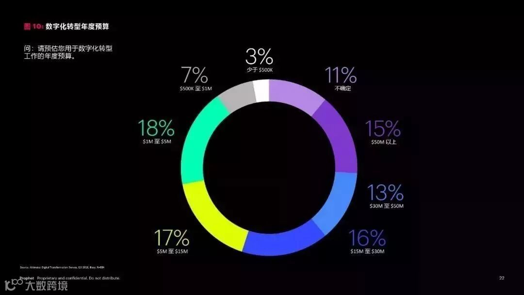 对于领导数字化转型工作的人员来说,获得企业支持依然是最大的挑战。在我们所研究的公司中,数字化转型通常被视为成本中心 (28%),ROI 也难以通过数据进行证明 (29%)。内部文化问题也是大难题,内部根深蒂固的观点、对于变革的抵制(26%) 及对法律和合规的忧虑 (26%) 都在妨碍着数字化转型的进程。