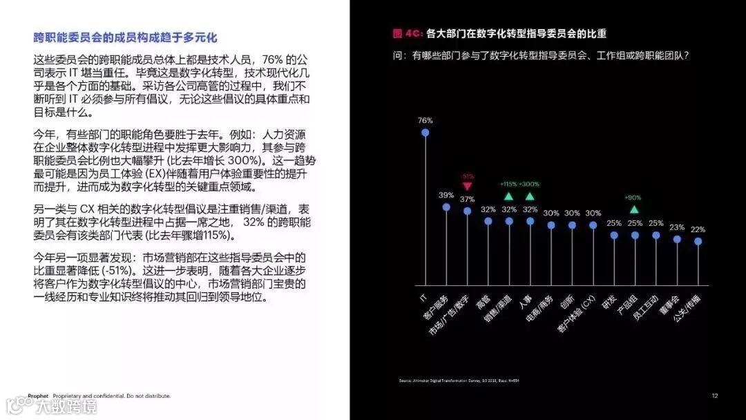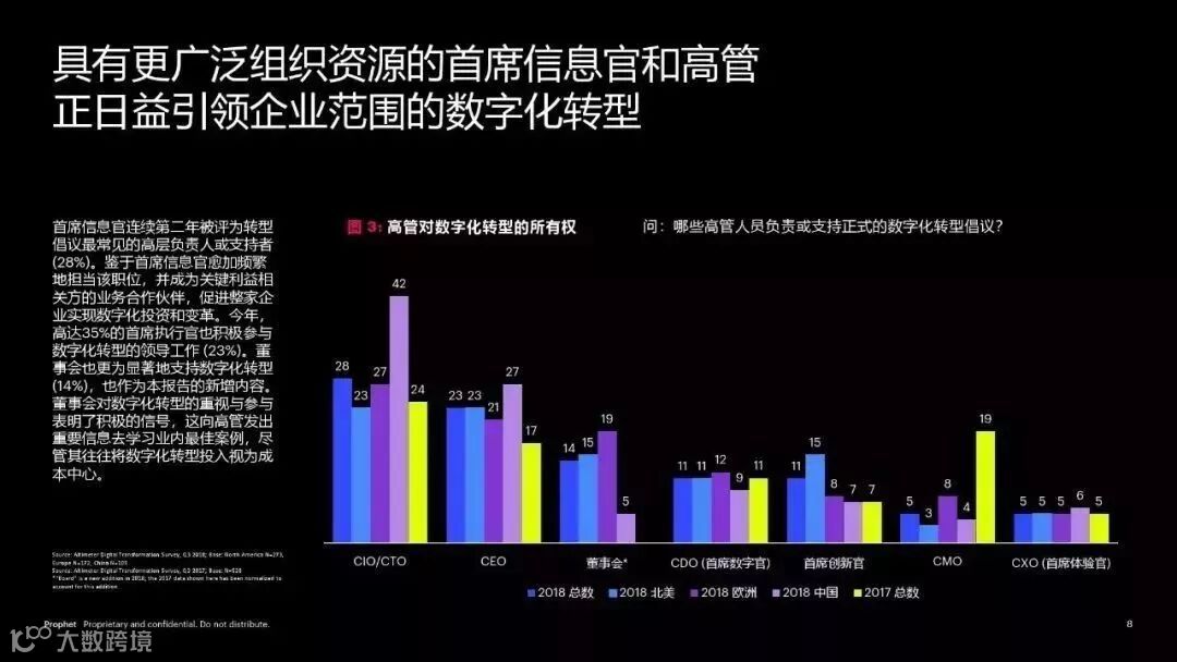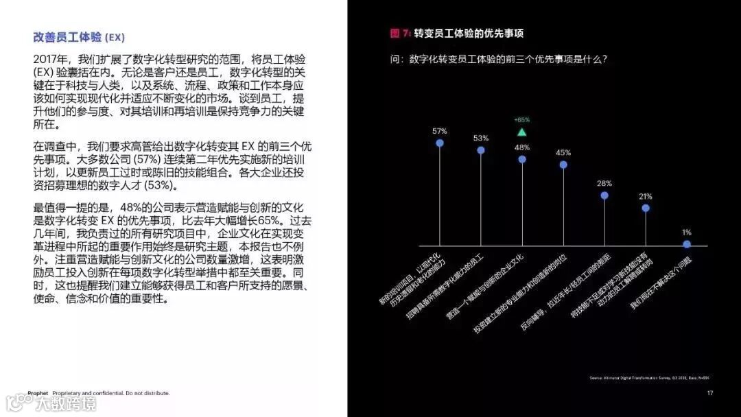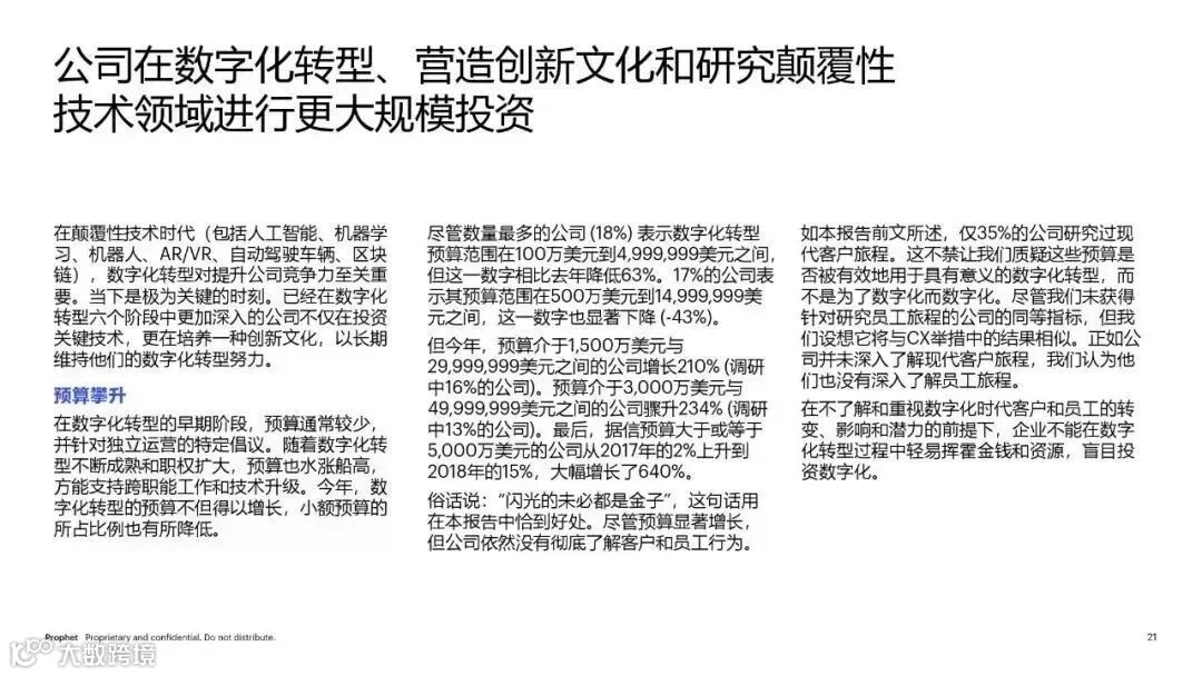 2019年,战略数字化转型的重要性已经不止于IT领域,而影响着全公司的竞争力。企业的相关预算直线攀升,利益相关方所关注的颠覆性技术数量急剧增加。数字化项目开始由首席高管主导,并由相互协作的跨职能团队管理。客户体验 (CX) 继续占据数字化转型投资的主要份额,但在2017年,我们注意到员工体验和企业文化在赋能和加速变革、增长和创新方面也愈发重要。